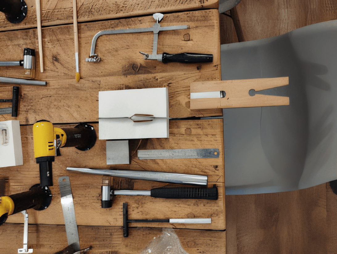 Hand tools are used alongside a simple power tool. Safety goggles provided.
